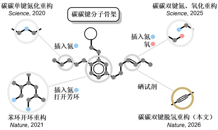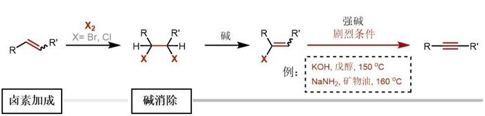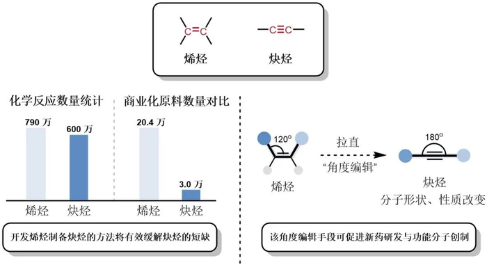 烯烃和炔烃是合成化学中的两类基础分子。烯烃中的碳碳键为双键,呈折线形结构,来源广泛、成本低廉;炔烃中的碳碳键为三键,呈直线形结构,种类有限、价格较高。将前者转化为后者,即“烯制炔”,在分子合成中属于一项基础但长期未能实用化的转化。