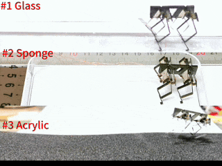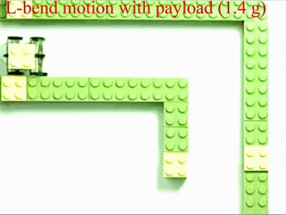 改变驱动信号即可实现后退、左转、右转等方向控制。测试中,该机器人在玻璃、亚克力、海绵等不同粗糙度表面均能移动,可爬升最大 12 度的斜坡,并在背负 1.4 克载荷的条件下,以每秒 8.56 厘米的速度通过长 16 厘米、宽 3 厘米的隧道,以及完成 L 形弯道的连续行进。