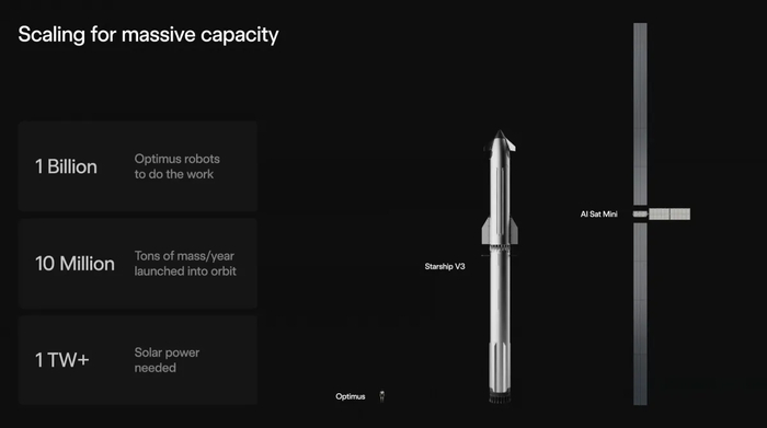 在此次演讲中,马斯克展示了一款名为“AI 卫星迷你版”(AI Sat Mini)的示意图,并称该型号卫星将用于该星座。每颗卫星可为星载人工智能处理器提供 100 千瓦电力。