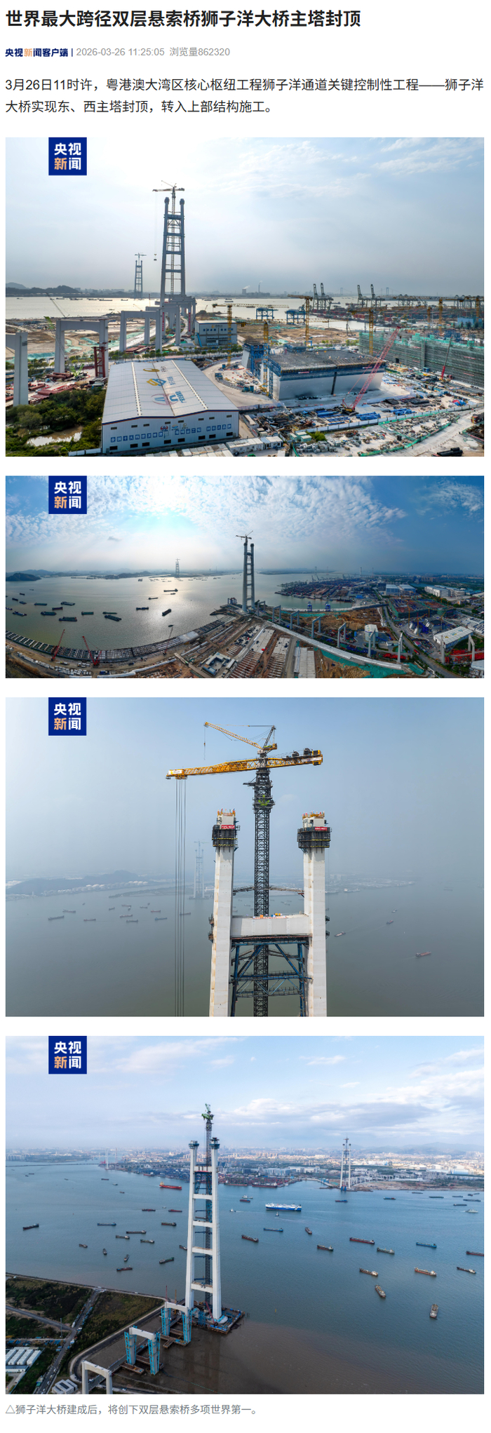 IT之家 3 月 26 日消息,据央视新闻报道,今日 11 时许,粤港澳大湾区核心枢纽工程狮子洋通道关键控制性工程 —— 狮子洋大桥实现东、西主塔封顶,转入上部结构施工。