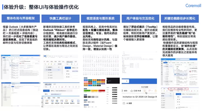 在邮件操作体验上,Coremail AI原生安全邮件系统更聚焦交互优化,通过三栏式信息结构、调整分组原则、浮动式提示等一系列设计,从用户角度大幅提升使用体验感。