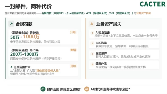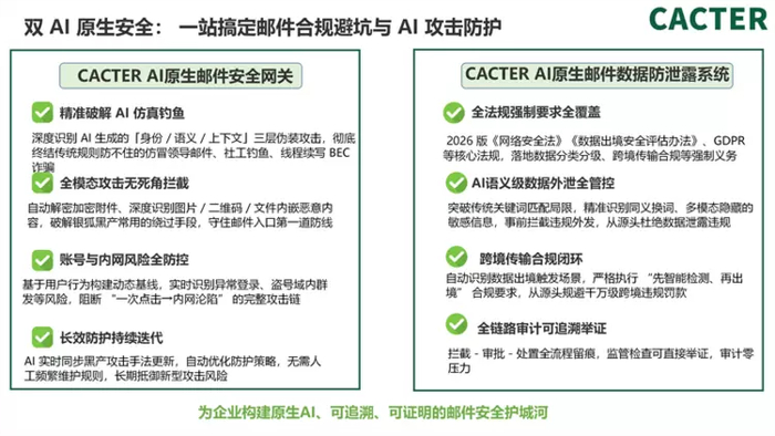 作为内外联通的重要工具,企业邮箱同时面临合规罚款与 AI 骗局的双重风险。为应对这一风险,Coremail旗下安全品牌CACTER结合新技术,全新升级推出AI原生邮件安全网关和AI原生邮件数据防泄露系统,为企业构建原生AI、可追溯、可证明的邮件安全护城河。