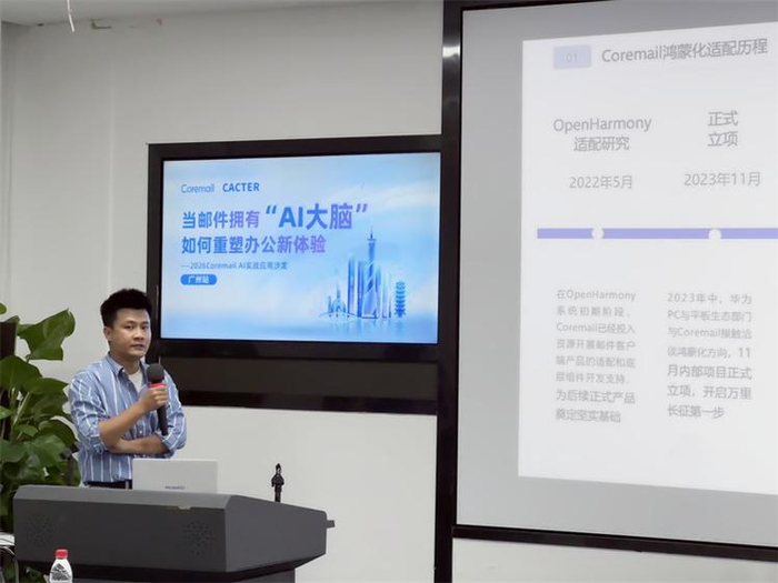 Coremail高级产品总监郝家雨重点介绍了HCMail。他提到,Coremail作为鸿蒙生态最早一批的深度参与者,从2022年开始鸿蒙适配的探索脚步,2023年正式立项,先后完成邮件标准协议SDK的研发,首个鸿蒙原生邮件客户端产品开发上线。Coremail基于在邮件领域27年的研发经验,结合闪电邮、Air客户端等成熟产品的技术方案,确定了在鸿蒙新系统上打造“华为0号客户”版本的目标,满足B端场景下邮箱应用的核心需求,成为鸿蒙商用不可或缺的重要办公应用。