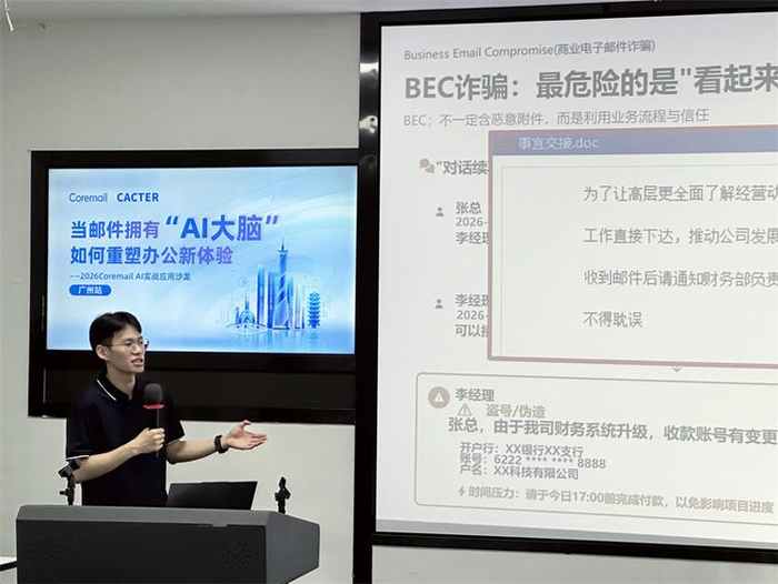 Coremail安全解决方案专家曾鑫结合网安新规和AI发展背景,深入剖析当前邮件攻防新态势,并带来实战案例分享。