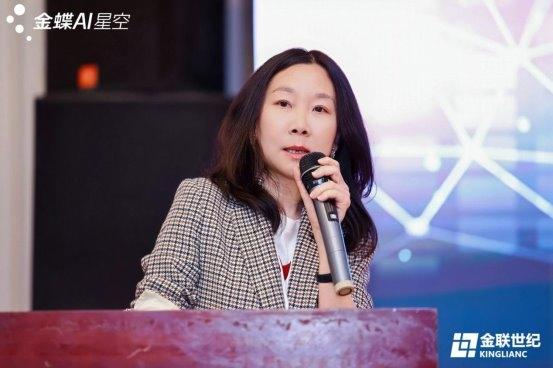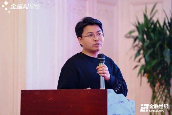 随后,北京金联世纪科技有限公司总经理毛英善先生发表致辞,深刻阐述了AI范式的根本性变革。他指出,AI正从辅助人类的“顾问”进化为能够直接理解业务、执行任务的“数字员工”,推动生产力从“对话式交互”迈向“端到端自动化”的“零阻力”进化。毛总强调,AI的赋能效果取决于“高质量的数据土壤、深厚的业务本体、完善的Skill生态”三大基石。他提出,AI不是SaaS的终结者,而是其最强大的进化加速器,金蝶早已提出AI EBC(企业业务能力)理念,推动企业从记录流程的“ERP”时代迈向智能驱动决策的“AI EBC”时代,实现从“记录系统”到“智能系统”的质变。