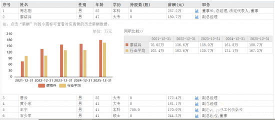 值得一提的是,虽然廖结兵2025年薪酬有所增长,但其仍不是公司的最高薪酬。董事长兼总经理周志刚2025年薪酬由2024年的290.8万元下调至257.2万元,虽减少了33.6万元,但仍为公司的最高薪酬。