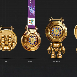 奖牌创新采用可展开结构,展开部分化身人形机器人躯体,与上方圆形主体组合,构成立体生动的人形机器人形态,整体兼具艺术观赏性与互动趣味性。