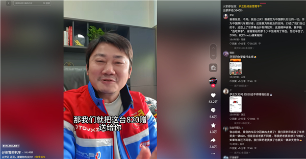 此事引起张雪机车创始人张雪的注意,他公开进行回应称:“按照剧本,应该请正哥做品牌代言人,但是我们实在是没钱,就把这台820赠送给你,后您就自己骑,骑一段时间后就发一个用车感受,哪里好、哪里不好都可以指出来,相当于一个骑行分享吧。”