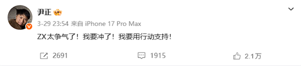 夺冠后,演员尹正,同时也是拥有专业赛车执照、签约职业车队、参与国内顶级赛事的硬核骑士公开发文祝贺,称张雪太争气了,自己要冲了,用行动支持!