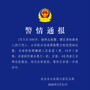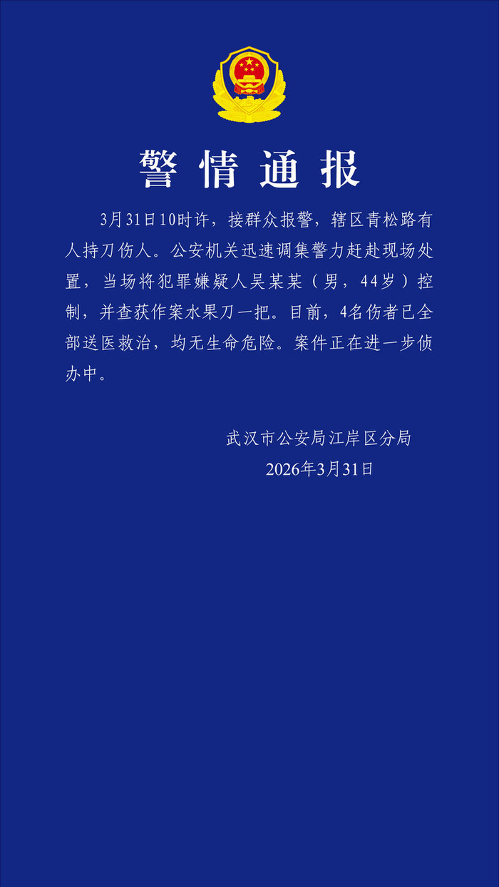 武汉警方通报持刀伤人事件:嫌犯当场被控制 4人受伤送医