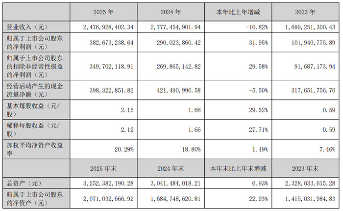 现金流及资产状况方面,2025年公司经营活动产生的现金流量净额为3.98亿元,较2024年的4.21亿元同比下降5.50%;截至2025年末,公司总资产达32.52亿元,较2024年末的30.41亿元同比增长6.93%;归属于上市公司股东的净资产为20.71亿元,较2024年末的16.85亿元同比增长22.93%。