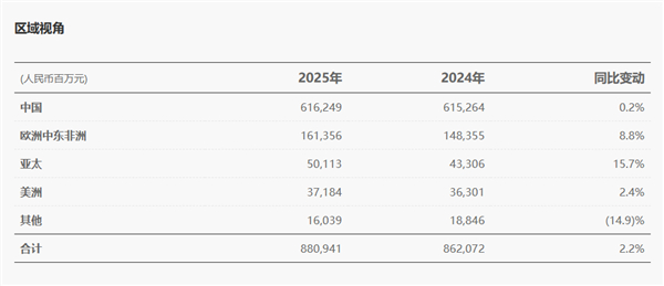 区域营收方面,中国市场仍为核心,实现6162.49亿元,同比微增0.2%。