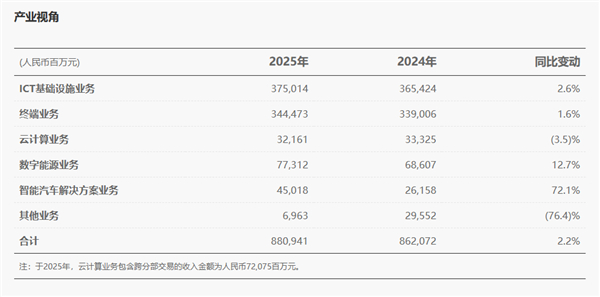 ICT基础设施业务作为基本盘,实现3750.14亿元收入,同比微增2.6%,5G-A商业落地与行业数智化转型成果显著。