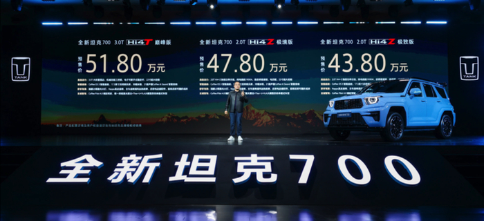 3 月 30 日,全新坦克 700 开启预售提供 Hi4-T 巅峰版、Hi4-Z 极境版和 Hi4-Z 极致版三款车型,预售价为 43.8 万元至 51.8 万元。