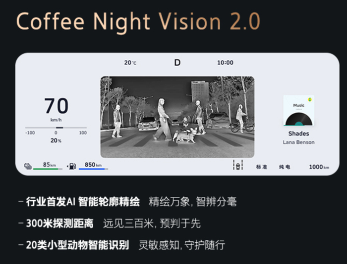 全新坦克 700 还配备了同级独有的 Coffee Night Vision 2.0 远红外夜视系统,最远探测距离 300 米,搭载千万参数级红外图像分割数据库,能够实现像素级物体轮廓勾勒,并对车辆、行人、动物进行差异化分色渲染。