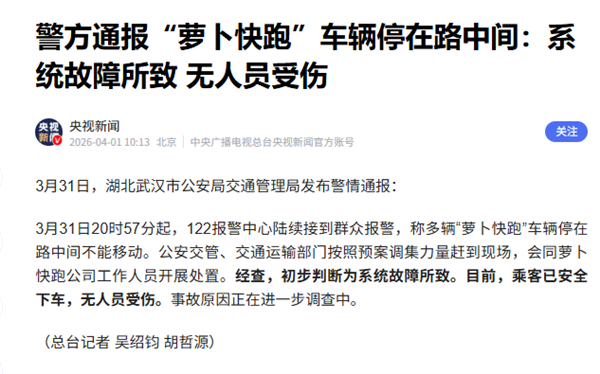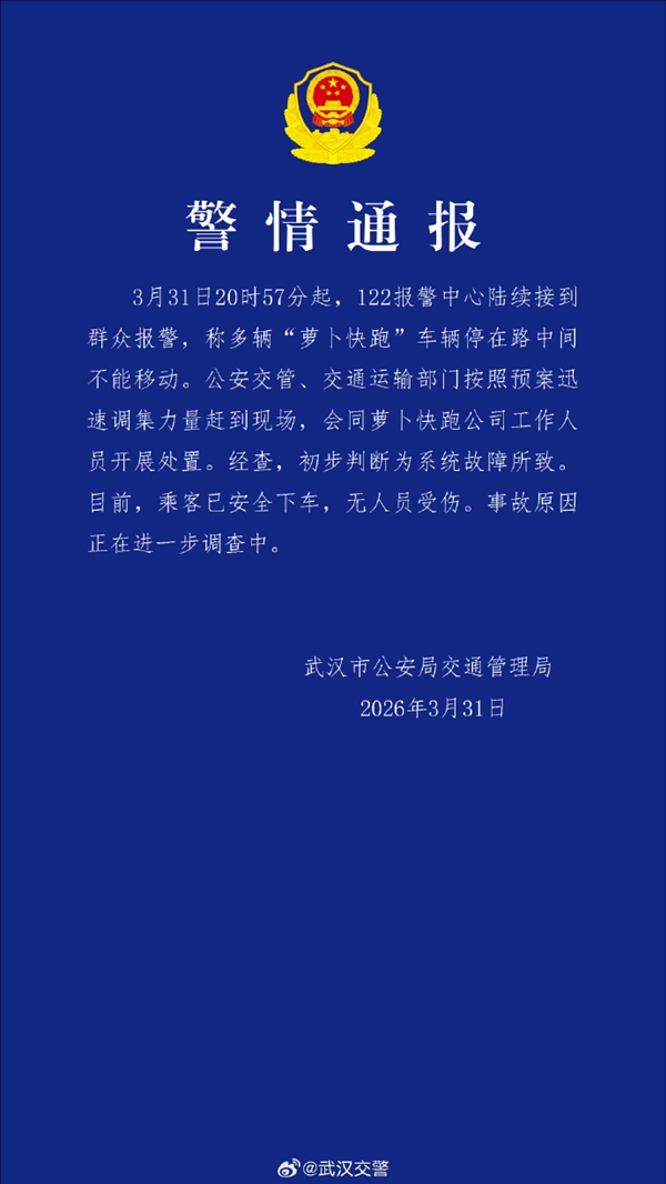 3月31日20时57分起,122 报警中心陆续接到群众报警,称多辆 “萝卜快跑” 车辆停在路中间不能移动。公安交管、交通运输部门按照预案调集力量赶到现场,会同萝卜快跑公司工作人员开展处置。