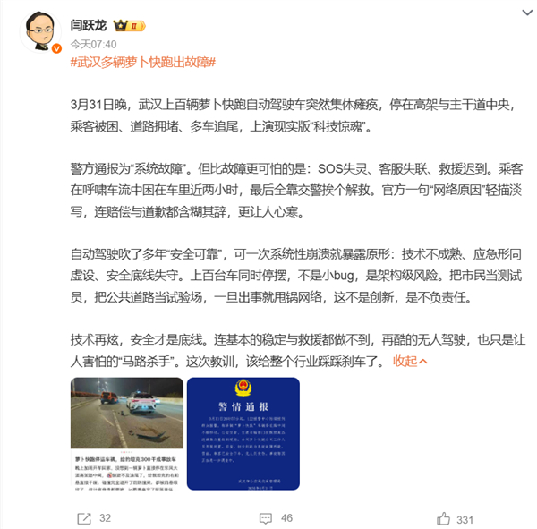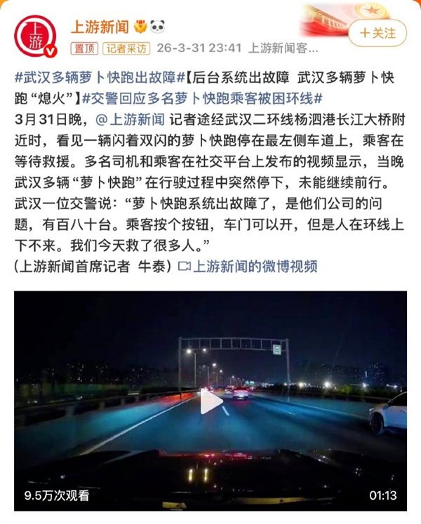 突然趴窝!武汉上百辆萝卜快跑自动驾驶汽车变路障:有人追尾有人绝望 官方通报原因