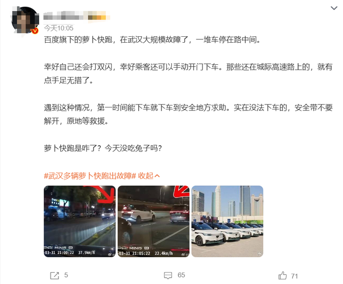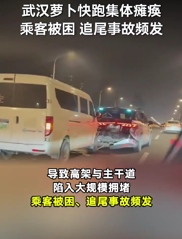 当晚,多位武汉网友在社交平台爆料,上百辆萝卜快跑车辆在行驶途中突然罢工停在在道路中央,不仅引发全城多条主干道、高架路大面积拥堵,更造成了追尾事故,据称涉及车辆达上百辆。