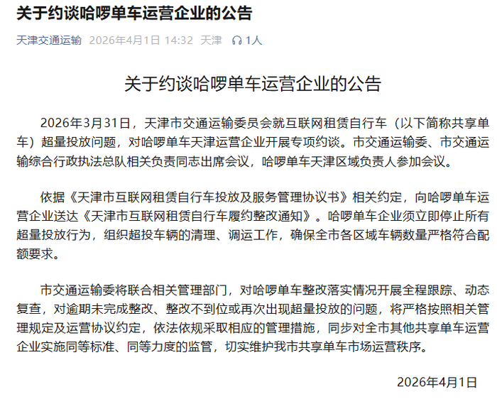 IT之家 4 月 1 日消息,天津市交通运输委员会于 2026 年 3 月 31 日就共享单车超量投放问题,对哈啰单车天津运营企业进行了专项约谈。