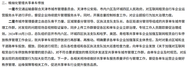 值得注意的是,据天津市城市管理委员会网站此前信息显示,今年1月,该委在答复相关提案时已明确提出,将进一步精细化管理共享单车停放秩序,督促各单车运营企业做好日常秩序管理、运维保障等工作,推动共享单车行业提升服务品质、实现规范发展。