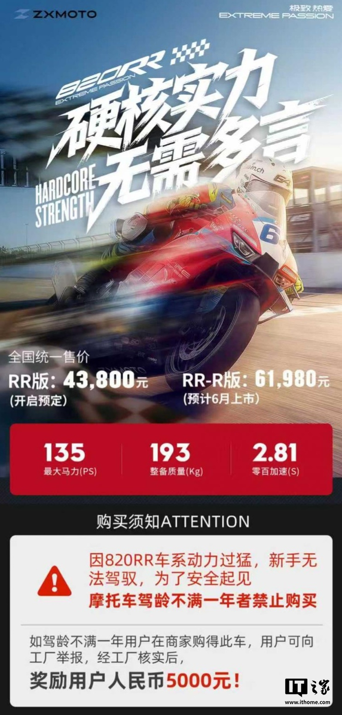 IT之家注意到,官方产品订购页面显示:因 820RR 车系动力过猛,新手无法驾驭,为了安全起见,摩托车驾龄不满一年者禁止购买。如驾龄不满一年用户在商家购得此车,用户可向工厂举报,经工厂核实后,奖励用户人民币 5000 元。