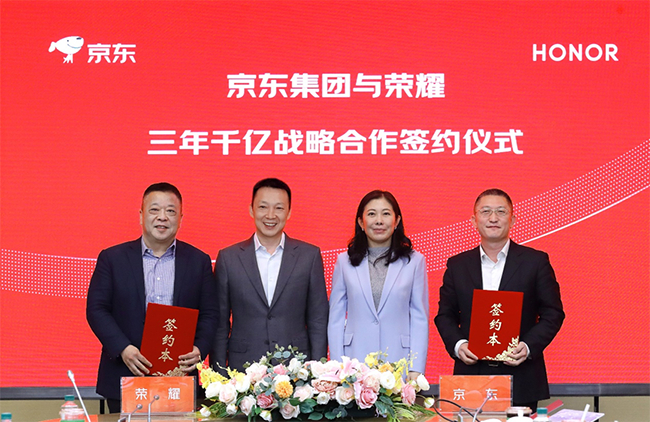 4月2日,荣耀与京东签订战略合作协议,正式建立全方位战略合作伙伴关系,双方将围绕产品共创、用户共营、生态共享三大核心领域,构建全面覆盖、深度融合、价值共生的新型合作体系,致力于实现三年累计规模超1000亿元的全领域合作目标。