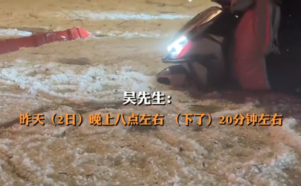 市民吴先生亲历了这场极端天气:冰雹持续倾泻20分钟后,堆积高度超过车门,连电动车车轮都被完全淹没,车辆根本无法移动。
