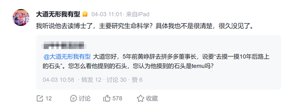 对此,段永平回复称:“听说他去读博士了,主要研究生命科学?具体情况不是很清楚,很久没见了。”