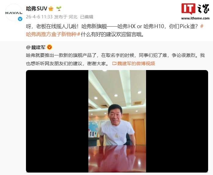 新车基于最新造车平台“归元”打造,预计定位 30 万级以上市场。IT之家注意到,长城汽车董事长魏建军今日也发布视频,称新车命名内部看法不统一,于是向网友征集新车命名的意见,到底是叫“哈弗 HX”还是“哈弗 H10”。