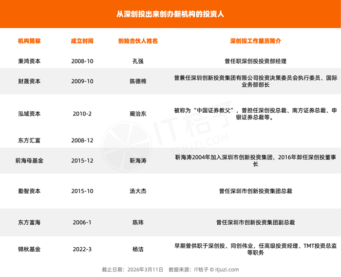 据IT桔子数据统计,秉鸿资本、财晟资本、泓域资本、东方汇富、前海母基金、勤智资本、东方富海的核心创始人均出自于深创投。