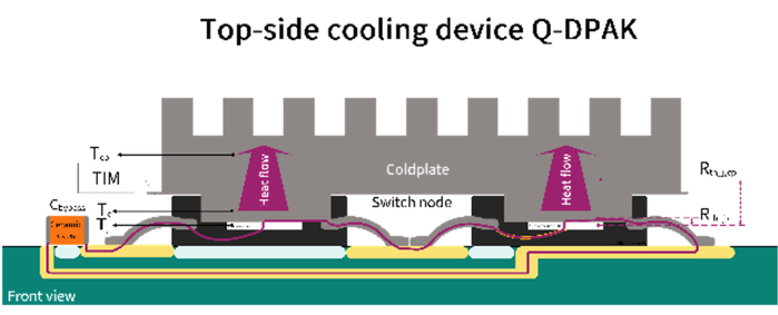 诸如Q-DPAK等TSC封装还具备一项显著优势,即可在封装顶部直接连接散热器或液冷系统。这种设计将散热路径与电气路径分离,从而提升散热效率,并降低热阻。借助TSC技术,功率器件和栅极驱动器可以布置在PCB的同一侧,其中,栅极驱动器在理想情况下位于底部。相比之下,器件的散热器则位于顶部,从而为设计提供更大灵活性和系统级集成度。