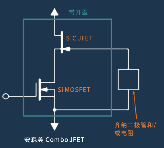 SiC Combo JFET 是一种由低压硅 MOSFET 与高压常开型 SiC JFET 组成的复合器件。与 cascode 器件结构不同,在该组合结构中,SiC JFET 的源极连接至低压 Si MOSFET 的漏极,从而使 JFET 和 MOSFET 的栅极均可独立接入以方便控制。