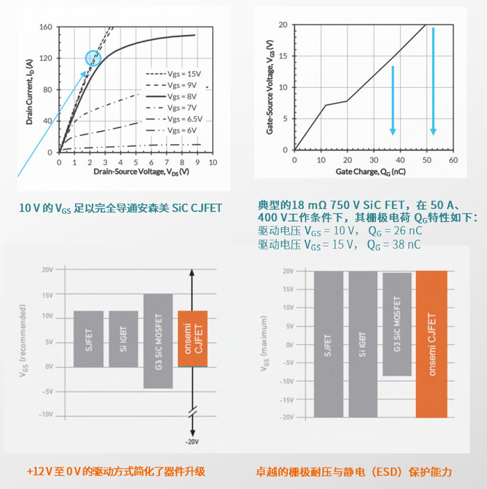 假设无需将栅极驱动电压(VGS) 提升至15V:如左上图所示,仅 9V的 VGS 即可近乎完全导通 SiC CJFET。因此,若仅采用 10V 而非 15V的 VGS 进行驱动(如右上图所示),器件的栅极电荷(QG)将降低12 nC —— 降幅达 30%,且不会对 RDS(on) 造成任何负面影响。这对于电源在轻载条件下降低高频 LLC 拓扑的栅极驱动损耗尤为重要。
