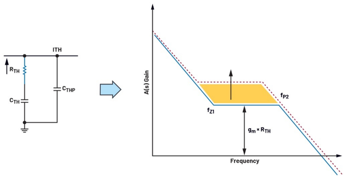 范围4:随着频率进一步增加,较小的并联CTHP阻抗最终下降到与RTH值相当的值。此后,ZITH幅度由CTHP阻抗决定。RTH和CTHP阻抗彼此接近的转折频率定义为“第二高频极点fP2”。当需要时,此高频极点应位于电源开关频率fSW以下,以便衰减开关噪声。