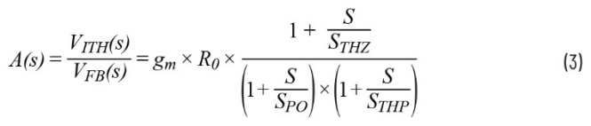 对于给定控制器IC,其内部gm和R0是固定的,因此由RTH、CTH和CTHP组成的网络的阻抗ZITH(s)决定了补偿增益A(s)。ADI应用笔记AN149给出了详细的公式推导过程(见公式3):1