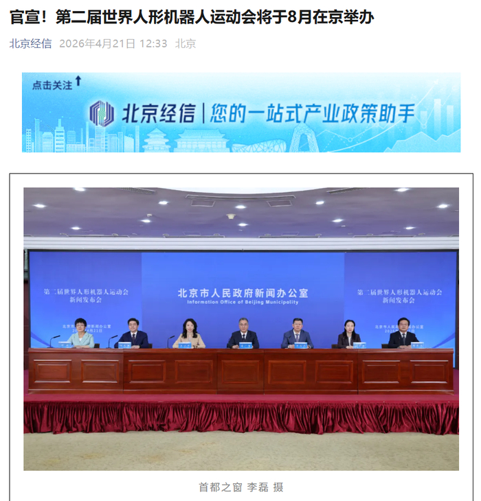 IT之家 4 月 21 日消息,据“首都之窗”官方消息,北京市人民政府新闻办公室今日(4 月 21 日)举行第二届世界人形机器人运动会新闻发布会。
