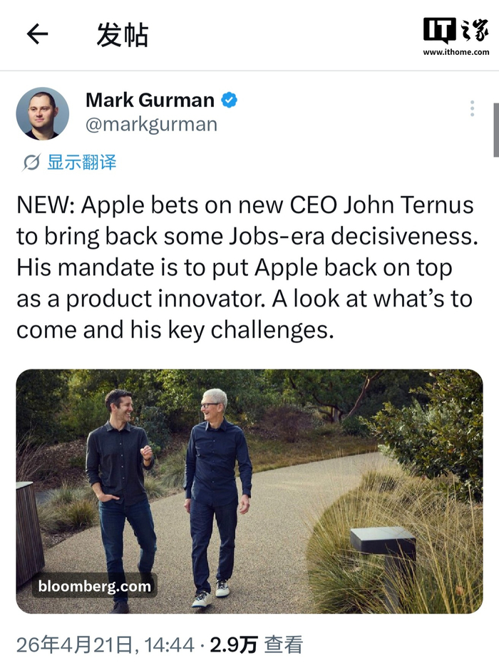 IT之家 4 月 21 日消息,苹果公司今日宣布,蒂姆 · 库克将出任苹果董事会执行董事长,硬件工程高级副总裁约翰 · 特纳斯将担任苹果下一任首席执行官,该任命自 2026 年 9 月 1 日起生效。