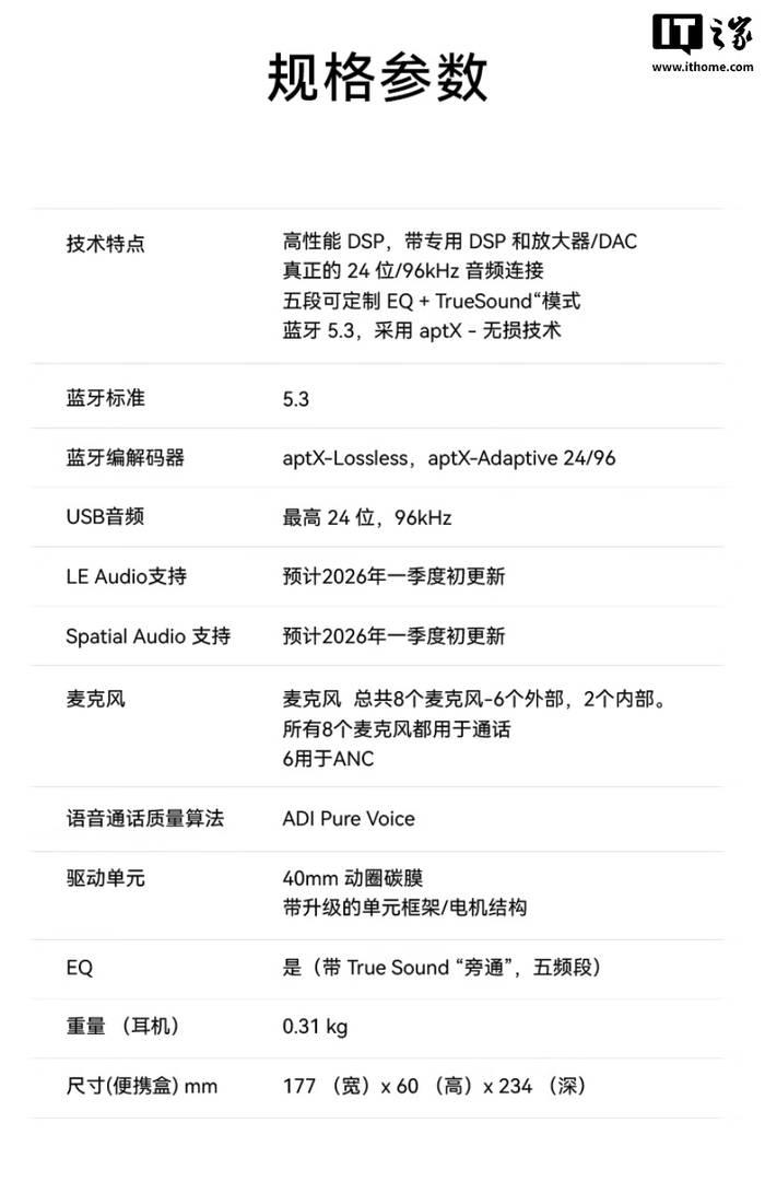 规格方面,该耳机延续了初代 Px8 的 40mm 碳膜单元,但配备了全新驱动架构,引入了全新 DSP 及放大单元,优化音质表现和失真,支持 aptX Adaptive(24-bit / 96 kHz)和 aptX Lossless。其续航长达 30 小时,支持 USB-C 快充,只需充电 15 分钟即可播放 7 小时音乐。
