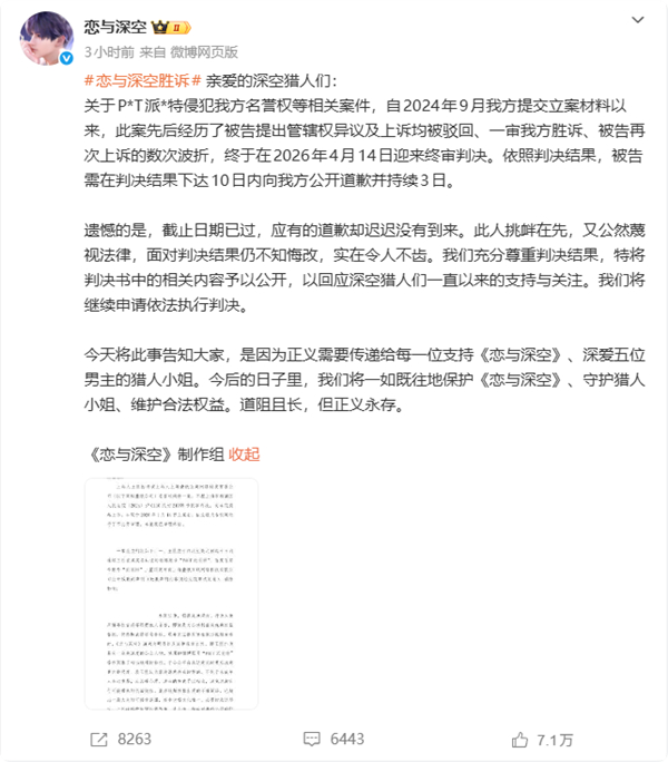 快科技4月25日消息,《恋与深空》官方发布公告,公开与歌手派克特名誉权纠纷案的终审判决书,案件已终审胜诉,但对方逾期未按判决要求公开道歉,官方表示将依法申请强制执行。
