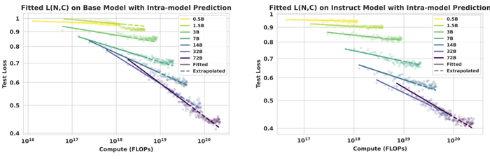 实验表明,该 Scaling 公式不仅能高精度拟合已有数据(R² > 0.99),并且具备实际的预测能力,具体体现在两个方面。