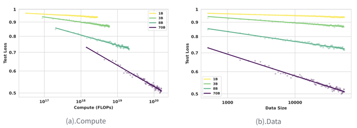 需要特别指出的是,这一公式在 Compute(C)和 Data(D)两个维度上具有统一的函数形式,即无论以算力还是数据量作为自变量,性能的 scaling 行为都遵循相同的数学结构。这种理论一致性为公式的可靠性提供了额外支撑。