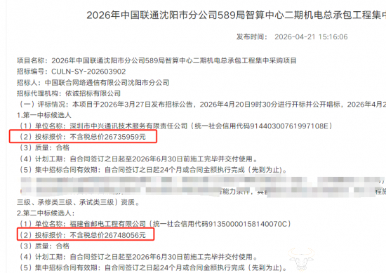 沈阳联通某智算中心花三千多万采购机电设备 投标人报价非常接近