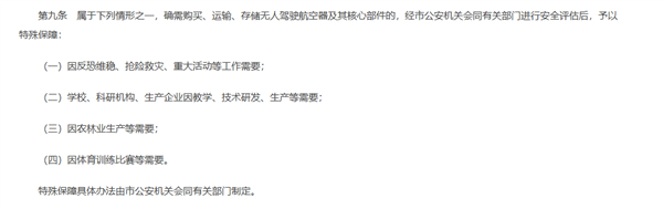 针对抢险救灾、重大活动,以及教学、技术研发、生产、农林业作业、体育训练赛事等需要,经公安机关等部门安全评估后可以购买、运输和存储无人机。