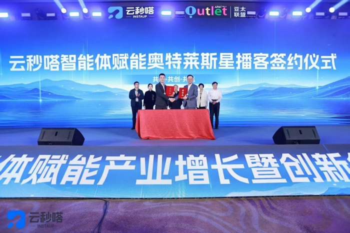 云秒嗒智能体赋能奥特莱斯星播客战略签约仪式隆重举行,云秒嗒 CEO 张源与奥特莱斯星播客董事长张李荣现场签约,杨志明、韩永文、张景安、马彬、胡燕、王健翔、伏学润七位领导共同见证。双方将以 AI 智能体为核心,在零售数智化、全域营销、用户运营等领域展开深度合作,打造 AI + 商业新标杆。
