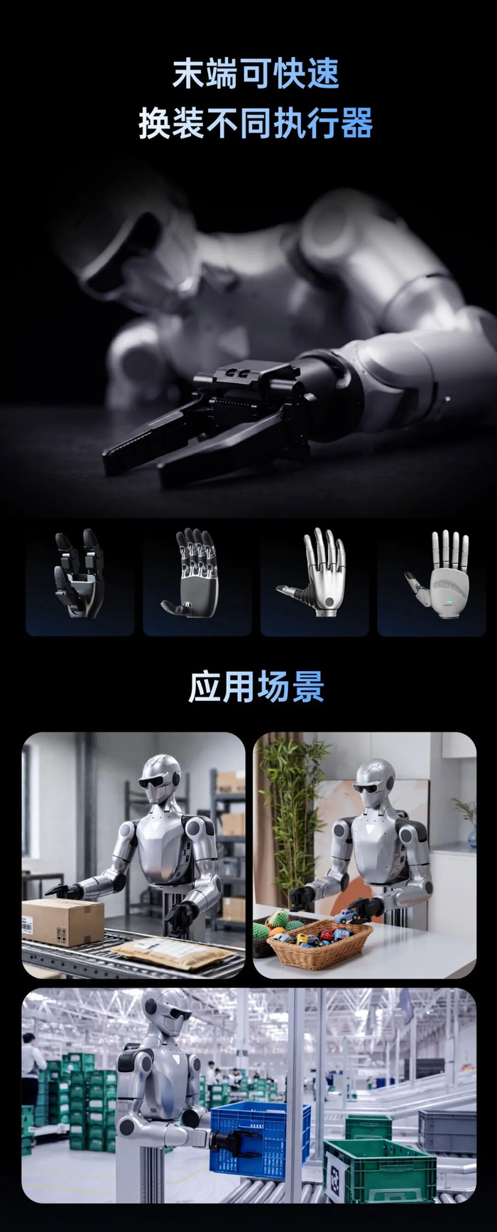宇树双臂人形机器人的末端可更换多种执行器,也就是不同种类的灵巧手,官方展示了双指、三指、五指等产品。
