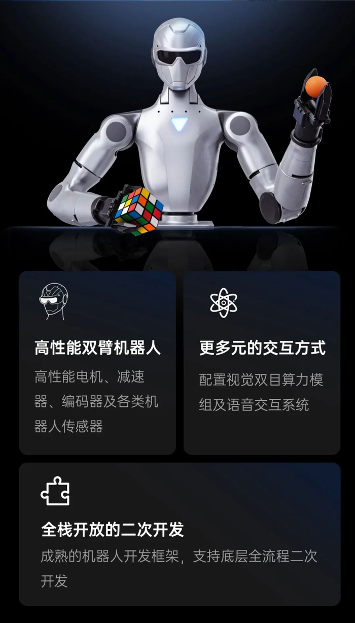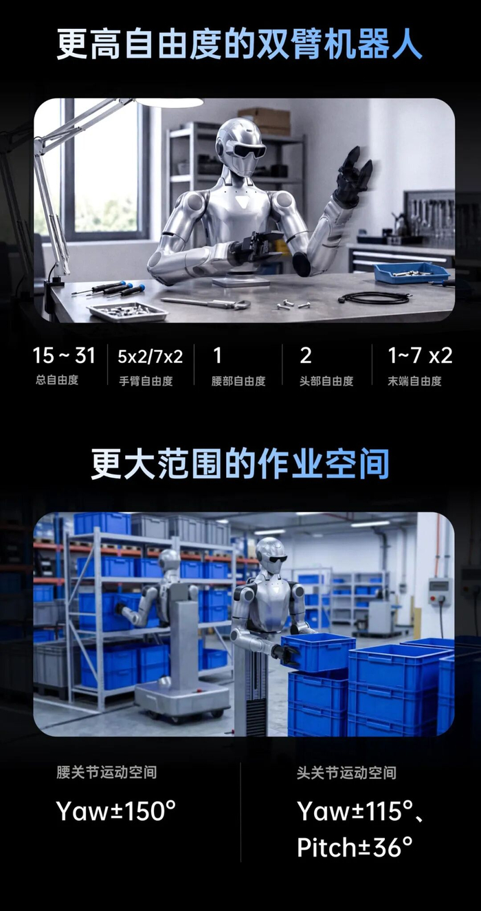 这款机器人主打上半身的双臂操作,配备视觉双目算力模组,支持 15~31 自由度,手臂自由度可选 5x2/7x2。