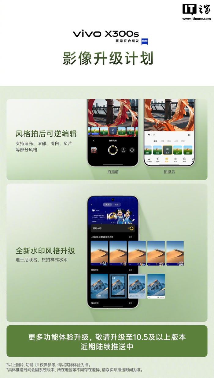 IT之家 4 月 30 日消息,vivo 官方今日宣布,X300 Ultra / X300s 手机的影像创作升级:新增与上海迪士尼度假区的联名样张水印、旅拍风格水印,同时支持多风格拍后编辑可逆等多个功能体验优化升级。