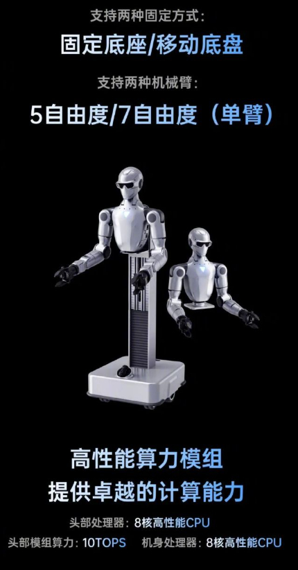 机身与头部均搭载8核CPU,头部模组算力达到10TOPS。配合视觉双目算力模组和语音交互系统,可实现多元人机交互。