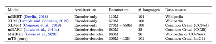 C4是从公共网站获得的大约750gb 的英文文本的集合,mC4是 C4的一个变体,C4数据集主要为英语任务设计,mC4搜集了过去71个月的网页数据,涵盖了107种语言,这比 C4使用的源数据要多得多。