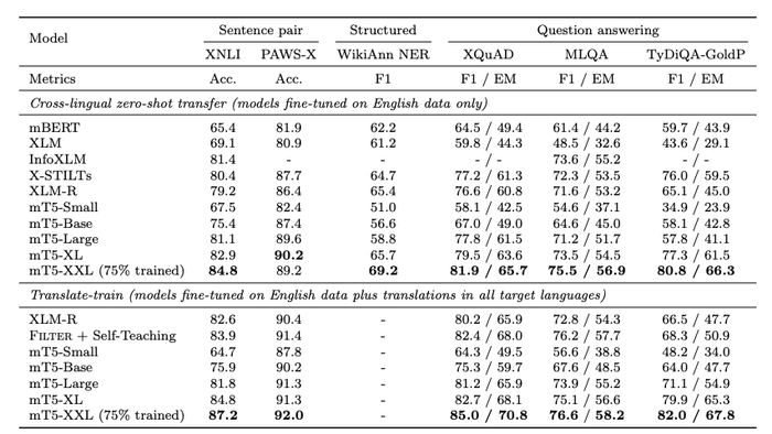 截至2020年10月,实验中最大 mT5模型拥有130亿个参数,超过了所有测试基准,包括来自 XTREME 多语言基准测试的5个任务,涵盖14种语言的 XNLI 衍生任务,分别有10种、7种和11种语言的 XQuAD、 MLQA 和 TyDi QA/阅读理解基准测试,以及有7种语言的 PAWS-X 释义识别。